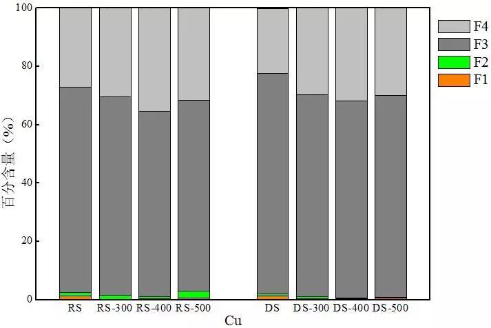 熱解后,兩種熱解炭中非穩(wěn)態(tài)Cu含量均有不同程度的降低,因此可以推斷經(jīng)過熱解后F1和F2態(tài)轉(zhuǎn)化為F3或F4態(tài)。在400 ℃熱解條件下熱解炭中穩(wěn)定態(tài)Cu含量最大,在500 ℃下熱解炭中殘?jiān)鼞B(tài)Cu相對(duì)于400 ℃會(huì)有小幅度降低,低溫對(duì)污泥中Cu的鈍化效果較佳。