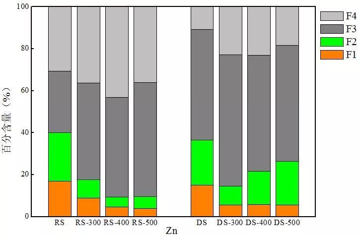 生污泥熱解炭隨熱解溫度升高,穩(wěn)定態(tài)含量增加,500 ℃下達(dá)到90.4%。而消化污泥熱解炭中Zn的穩(wěn)定態(tài)含量卻表現(xiàn)減小的趨勢,在300 ℃熱解條件下穩(wěn)定態(tài)含量最大,為85.5%。兩種熱解炭中F3態(tài)金屬含量較原污泥均有大幅度的提升,以生污泥熱解炭為例,生污泥中F3態(tài)金屬含量為30%,而500 ℃下熱解炭中F3態(tài)金屬含量卻達(dá)到了54%。對(duì)比兩種熱解炭的重金屬分布可以發(fā)現(xiàn),消化污泥熱解炭中的非穩(wěn)態(tài)Zn含量高于生污泥熱解炭,但消化污泥熱解炭中F3態(tài)Zn含量卻顯著高于生污泥熱解炭,這可能也是厭氧消化后污泥中F3態(tài)Zn含量大幅度增加所導(dǎo)致。