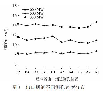 圖3為反應(yīng)器出口煙道的速度場(chǎng)分布示意圖,從圖可知,出口煙氣流速與負(fù)荷關(guān)系密切,且與測(cè)孔位置有關(guān)。3種負(fù)荷工況下,B側(cè)速度均值分別為14.1、11.3、8.4m?s-1,A側(cè)均值分別為13.8、10.6、8.3m?s-1,均值比分別為1.02、1.07、1.00。