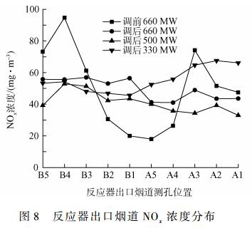 可知,機(jī)組調(diào)前在660MW負(fù)荷下,均值濃度分別為56、43.5mg?m-3,但不同測(cè)孔的NOx濃度差異較大,其中B側(cè)NOx濃度最大偏差為74.7mg?m-3、而A側(cè)為56.2mg?m-3。噴氨格柵優(yōu)化調(diào)整后,NOx均值濃度基本不變,而在660、500、330MW負(fù)荷下,NOx濃度差異性均明顯降低,B側(cè)最大偏差分別降至3.9、13.6、8.6mg?m-3,而A側(cè)對(duì)應(yīng)偏差分別為7.9、7.0、15.1mg?m-3。