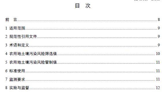 本標(biāo)準(zhǔn)規(guī)定了農(nóng)用地土壤污染風(fēng)險篩選值和管制值,以及監(jiān)測、實(shí)施與監(jiān)督要求。