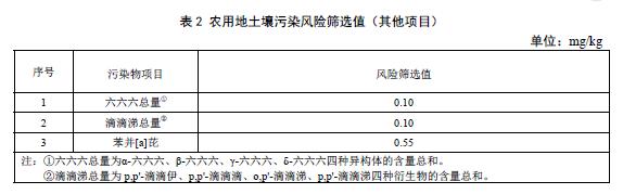 4.2.1農(nóng)用地土壤污染風(fēng)險篩選值的其他項(xiàng)目為選測項(xiàng)目,包括六六六、滴滴涕和苯并[a]芘,風(fēng)險篩選值見表2。