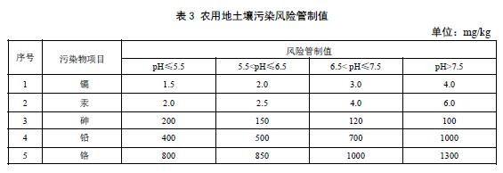 5.1農(nóng)用地土壤污染風(fēng)險管制項(xiàng)目包括鎘、汞、砷、鉛、鉻,風(fēng)險管制值見表3。
