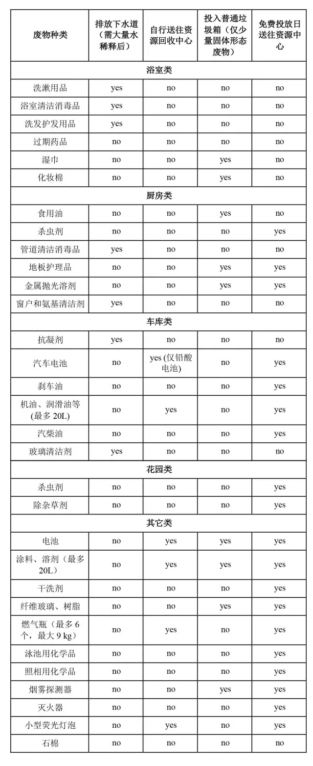 家庭危險(xiǎn)廢物包括漂白劑、花園和泳池用化學(xué)品、油漆、溶劑等。居民可打電話給市政部門上門收集,或包裝好送往資源處理中心,但處理都會收費(fèi)。每年每個(gè)區(qū)域(類似我們的街道)都會有兩三次免費(fèi)日,在這幾天送危險(xiǎn)廢物將不收費(fèi)。由于危險(xiǎn)廢物種類繁多,為了便于居民區(qū)分這類廢物與其它廢物,市議會有詳細(xì)的垃圾投放指導(dǎo),如表2所示。