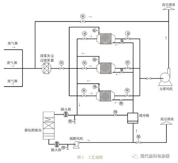 本著安全、節(jié)能、方便、可靠、經(jīng)濟的原則,預(yù)防廢氣中含有少量粉塵顆粒。首先有機廢氣經(jīng)組合干式過濾器,去除廢氣中的漆霧粉塵及顆粒物,以防活性碳微孔被堵塞,延長活性炭的使用周期,然后將符合吸附條件的有機廢氣送入活性炭吸附箱進行吸附凈化,凈化后的潔凈氣體由主排風機排入大氣中。吸附裝置配有備用吸附箱1套,當活性炭吸附飽和后通過控制閥門切換至催化燃燒脫附狀態(tài);脫附再生系統(tǒng)采用在線脫附再生,即吸附過程為連續(xù)式處理工藝,在備用吸附裝置投入使用同時,飽和吸附箱則進行脫附工作,脫附后活性炭箱預(yù)備至下次循環(huán)使用。