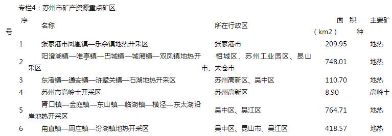 以地?zé)?、高嶺土等蘇州優(yōu)勢特色礦產(chǎn)為主,在張家港市、昆山市、吳中區(qū)、吳江區(qū)、高新區(qū)等資源較為豐富和集中的區(qū)域劃定6個重點(diǎn)礦區(qū)。