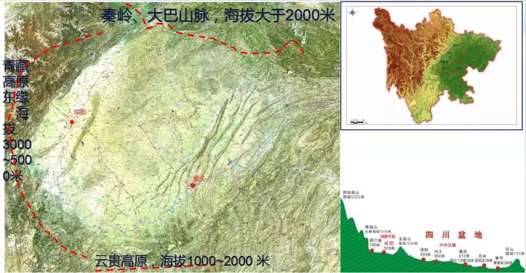 四川盆地北面是海拔大于2000米的秦嶺、大巴山脈,南面是海拔在1000-2000米的云貴高原,西面的海拔在3000-5000米的青藏高原,成合圍之勢(shì)。