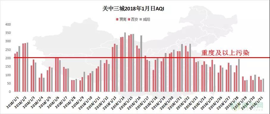 2018年1月份,關(guān)中地區(qū)西安、咸陽(yáng)、渭南三城分別經(jīng)歷10、11和12天的重污染天,占三分之一之多。