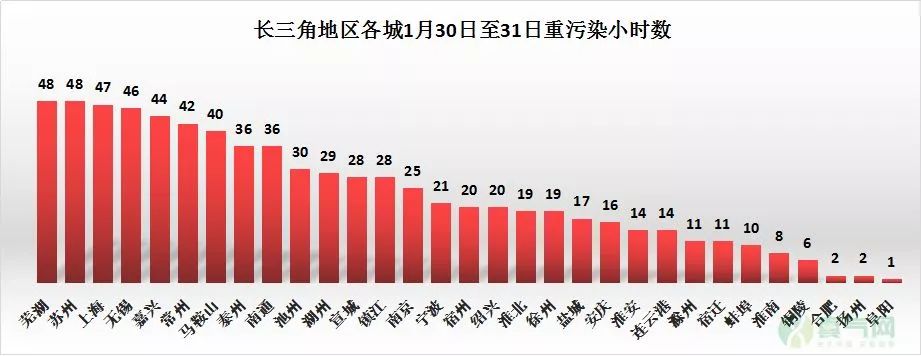 1月30日至31日,長(zhǎng)三角地區(qū)各城市中,蕪湖、蘇州、上海重度及以上污染小時(shí)數(shù)已經(jīng)高達(dá)7至48小時(shí),幾乎到達(dá)極限。據(jù)了解,此次空氣污染主要由上一波冷空氣帶來(lái),從30日凌晨至今一直停留在長(zhǎng)三角中部地區(qū),由于長(zhǎng)三角中北部目前沒(méi)有有利的擴(kuò)散條件,風(fēng)很小,也造成長(zhǎng)三角地區(qū)連續(xù)兩天空氣污染都處于較高水平。