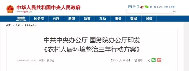 5號,中共中央辦公廳 國務(wù)院辦公廳印發(fā)《農(nóng)村人居環(huán)境整治三年行動方案》?!斗桨浮访鞔_,以建設(shè)美麗宜居村莊為導(dǎo)向,以農(nóng)村垃圾、污水治理和村容村貌提升為主攻方向,到2020年,實(shí)現(xiàn)農(nóng)村人居環(huán)境明顯改善,村莊環(huán)境基本干凈整潔有序,村民環(huán)境與健康意識普遍增強(qiáng)。