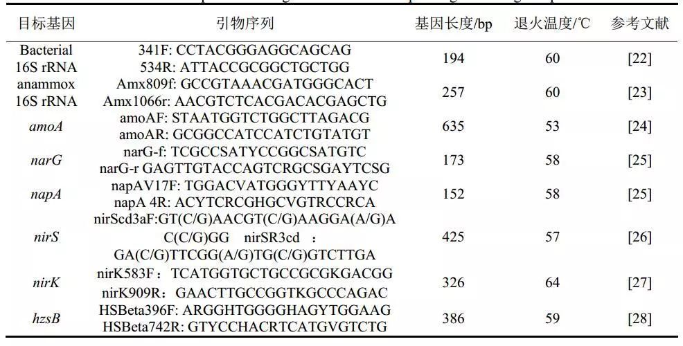 污泥樣品采用FastDNA SPIN Kit for soil試劑盒提取污泥DNA,而后用NanoDrop 2000超微量紫外分光光度計(jì)定量,采用SYBR® Green染料法進(jìn)行定量PCR分析。選取目標(biāo)基因包括:細(xì)菌16S rRNA基因、厭氧氨氧化菌16S rRNA基因及部分氮素轉(zhuǎn)化功能基因,以含有目標(biāo)基因的質(zhì)粒標(biāo)準(zhǔn)品建立標(biāo)準(zhǔn)曲線(R2 > 0.999)。擴(kuò)增體系為25 μL,含12.5 μL 2 × SYBR® Green PCR Master Mix(Vazyme,中國),2 μL模板DNA(20 ng/μL),正反引物各0.2 μL,10.1 μL無菌超純水;擴(kuò)增程序在熒光定量PCR儀AB7500(Life Technologies, 美國)進(jìn)行,每個(gè)樣品做三個(gè)平行,具體參數(shù)如表1所示。