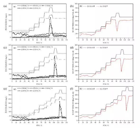 能厭氧氨氧化污泥富集培養(yǎng)過程中,為考察鐵離子的影響,反應(yīng)器保持同步容積氮負(fù)荷提升,直至運(yùn)行穩(wěn)定。反應(yīng)器R1、R2、R3進(jìn)出水氮素指標(biāo)、容積氮負(fù)荷及氮去除速率如圖2所示。