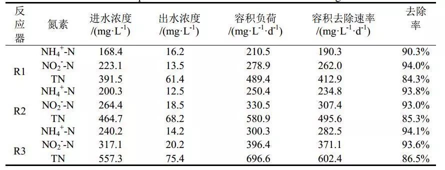 在厭氧氨養(yǎng)護(hù)污泥富集培養(yǎng)中,由于厭氧氨氧化菌生長緩慢,反應(yīng)器容積負(fù)荷有限。許多研究證明了高氮素基質(zhì)對(duì)厭氧氨氧化菌的抑制作用。Strous等研究表明亞硝酸鹽濃度達(dá)到100 mg/L,即可強(qiáng)烈抑制厭氧氨氧化菌活性;本研究以出水亞硝酸鹽濃度高于100 mg/L作為反應(yīng)器超過可承受負(fù)荷并失穩(wěn)的依據(jù)。對(duì)照組R1在運(yùn)行90 d時(shí),容積氮負(fù)荷超出反應(yīng)器承受極限,出水NH4+-N和NO2--N濃度急劇升高,類似失穩(wěn)現(xiàn)象也出現(xiàn)在試驗(yàn)組R2(第102 d)、R3(第114 d)。反應(yīng)器失穩(wěn)后,降低進(jìn)水基質(zhì)氮濃度,同時(shí)加大回流比以解除基質(zhì)自抑制;由于EGSB反應(yīng)器抗沖擊負(fù)荷能力強(qiáng),反應(yīng)器很快恢復(fù)穩(wěn)定運(yùn)行。穩(wěn)定階段反應(yīng)器運(yùn)行狀況如表2所示。Chen等通過批次試驗(yàn)證明了3.68 mg/L的鐵離子添加下,比厭氧氨氧化活性可提高533.2%;長期試驗(yàn)證明,鐵離子的添加,相較于控制組,提升了19.5%的反應(yīng)器容積負(fù)荷,與本研究結(jié)果類似。