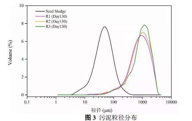 本研究采用EGSB反應(yīng)器培養(yǎng)厭氧氨氧化污泥,接種污泥為絮狀反硝化污泥,取接種污泥及130 d污泥樣品,用激光粒度儀分析其粒徑,結(jié)果如圖3所示。