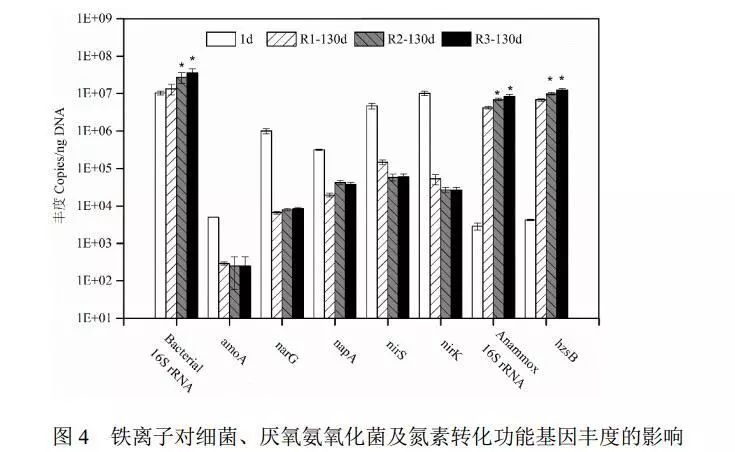 聯(lián)氨合成酶為厭氧氨氧化菌的重要功能蛋白,其編碼基因hzsB豐度經(jīng)富集培養(yǎng)過程也明顯提高;130 d時(shí),對(duì)照組R1中hzsB豐度為6.83×106 copies/ng DNA,而試驗(yàn)組R2、R3中其豐度分別為9.86×106、1.24×106 copies/ng DNA,顯著高于對(duì)照組R1(p < 0.05)??梢酝茰y(cè),鐵離子對(duì)厭氧氨氧化菌富集具有一定促進(jìn)作用,同時(shí)提高了厭氧氨氧化活性,也與反應(yīng)器脫氮效能結(jié)果一致。