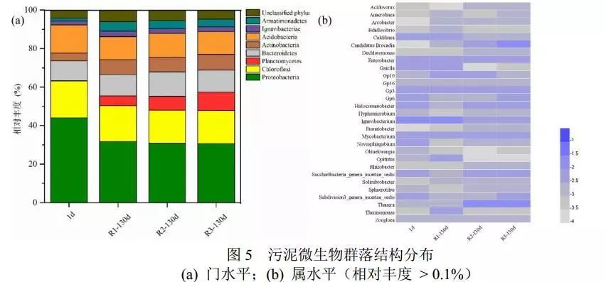 圖5(b)為污泥微生物屬水平熱圖??梢钥闯?,厭氧氨氧化菌Candidate Brocadia明顯富集;接種污泥中Candidate Brocadia菌難以檢測(cè)其豐度(< 0.01%),經(jīng)130 d的富集培養(yǎng),對(duì)照組R1污泥樣品中厭氧氨氧化菌Candidate Brocadia相對(duì)豐度為4.2%,而試驗(yàn)組R2、R3污泥樣品中其豐度分別為6.8%、8.2%,高于對(duì)照組R1。
