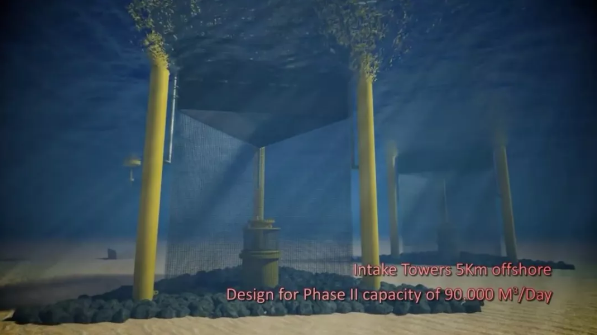 海水首先進(jìn)入一個(gè)裝有水母過(guò)濾裝置的取水塔,這個(gè)取水塔距離廠房6公里以外的水域,同時(shí)還備有石油泄露污染警報(bào)浮標(biāo)。