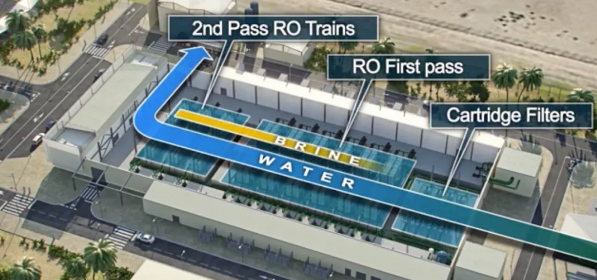 最后再用兩段式反滲透來(lái)去除海水中的溶解性雜質(zhì)和鹽,這套設(shè)備還有能量回收系統(tǒng)。