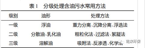 在油田采油污水中,根據(jù)原油粒徑的不同分為四種油形。中國大多數(shù)油田常采用一級處理也就是 預(yù)處理去除浮油,二級處理來破乳和去除分散油,深 度處理主要是除掉溶解油。富含不同油形含油污水 常用處理方法具體見表 2。