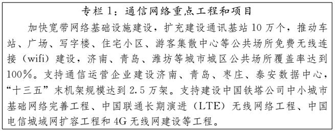 ?。ㄒ唬娀椖繋?,提升產(chǎn)業(yè)規(guī)模組織實施重大基礎(chǔ)設(shè)施項目。積極推進山東半島自主創(chuàng)新示范區(qū)、黃河三角洲國家農(nóng)業(yè)高新技術(shù)產(chǎn)業(yè)示范區(qū)建設(shè)。完善高技術(shù)產(chǎn)業(yè)基地、戰(zhàn)略性新興產(chǎn)業(yè)示范基地的基礎(chǔ)設(shè)施,提高產(chǎn)業(yè)承載能力。規(guī)劃建設(shè)山東省藍谷區(qū)域創(chuàng)新中心等一批省級區(qū)域創(chuàng)新中心,推進區(qū)域創(chuàng)新資源的開放共享,打造形成特色優(yōu)勢顯著的“創(chuàng)新谷”。落實智慧城市、寬帶山東、大數(shù)據(jù)等重大戰(zhàn)略,推進新一代網(wǎng)絡(luò)通訊、大數(shù)據(jù)中心等基礎(chǔ)設(shè)施建設(shè),提升支撐能力。