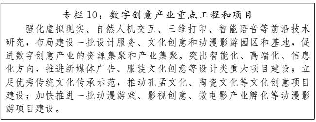 ?。ㄆ撸?shù)字創(chuàng)意產(chǎn)業(yè)。以文化創(chuàng)意、設(shè)計服務(wù)為核心,引導(dǎo)支持數(shù)字創(chuàng)意產(chǎn)業(yè)領(lǐng)域的產(chǎn)品、服務(wù)、技術(shù)、模式、業(yè)態(tài)創(chuàng)新,實現(xiàn)與相關(guān)產(chǎn)業(yè)融合發(fā)展,著力構(gòu)建文化引領(lǐng)、技術(shù)先進、要素齊備、鏈條完整、結(jié)構(gòu)合理、效益良好的數(shù)字創(chuàng)意產(chǎn)業(yè)發(fā)展格局?!笆濉逼陂g,數(shù)字創(chuàng)意產(chǎn)業(yè)產(chǎn)值年均增長25%以上,占GDP比重逐年提高。