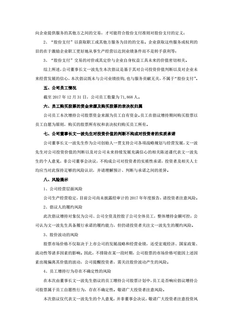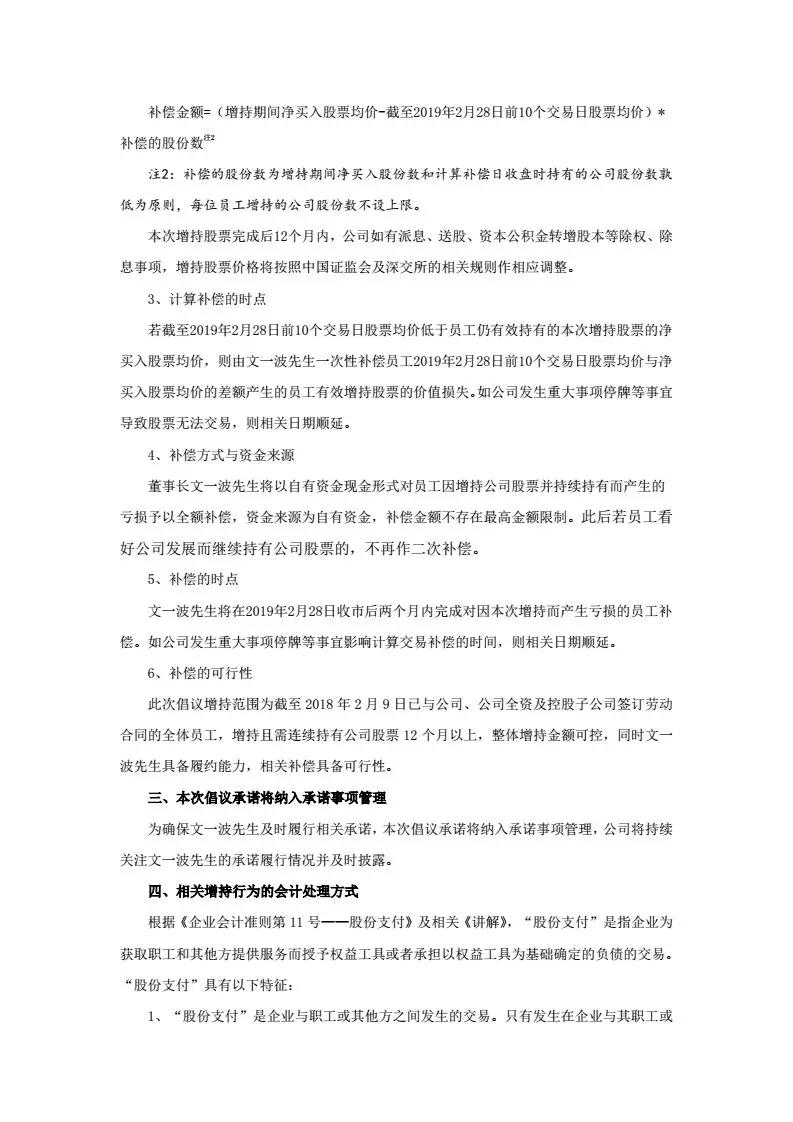 二、補償不設(shè)上限?!岸麻L文一波先生將以自有資金現(xiàn)金形式對員工因增持公司股票并持續(xù)持有而產(chǎn)生的虧損予以全額補償,資金來源為自有資金,補償金額不存在最高金額限制?!睋Q句話說就是,虧多少,補多少,你虧,董事長補!