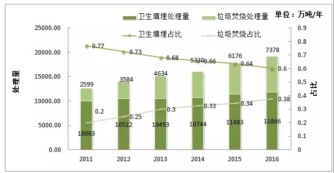 2011-2016 城市垃圾處理量及占比走勢 (注:數(shù)據(jù)來自住建部國家統(tǒng)計(jì)年鑒)