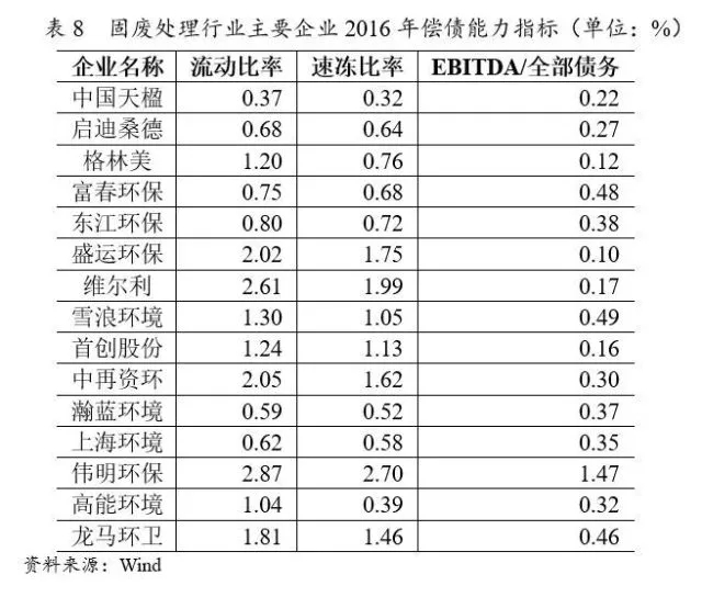 總體看,2016年固廢處理行業(yè)整體信用情況有所改善;截至2016年底,固廢處理行業(yè)整體資產(chǎn)規(guī)模保持增長(zhǎng),行業(yè)整體債務(wù)負(fù)擔(dān)有所上升;2016年,行業(yè)盈利規(guī)模和盈利能力均有所提升,經(jīng)營(yíng)活動(dòng)現(xiàn)金流有所改善。