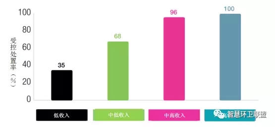 圖7展示了不同收入水平國家廢物受控處置的比例。受控處置指廢物在安全的設(shè)施中得到足夠的處理,處理的結(jié)果能夠滿足法規(guī)的要求。需要指出的是,受控的處置設(shè)施不一定必須要滿足歐盟或美國的要求,即接受了升級改造的傾倒場所也可以被認為是受控設(shè)施。