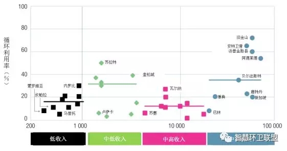 圖8展示了39座不同收入水平城市的循環(huán)利用率,將正式和非正式渠道都納入了考慮范圍。從圖表中可以看出,回收利用率與收入水平間并不存在十分明確的相關(guān)關(guān)系;雖然高收入水平國際的回收利用率是最高的,但一些低收入、中低收入國家的回收利用率也相當(dāng)?shù)膬?yōu)秀,達到了20%~40%。需要引起注意的是,一些發(fā)展程度更高的中高收入國家的回收利用率反倒更低,原因則可能是,隨著生活水平的提高,城市固廢的收運作為一項市政服務(wù)得到了發(fā)展,取代了非正式的回收利用體系,而高收入國家正式的回收利用體系則還沒有在此類國家完全成型。