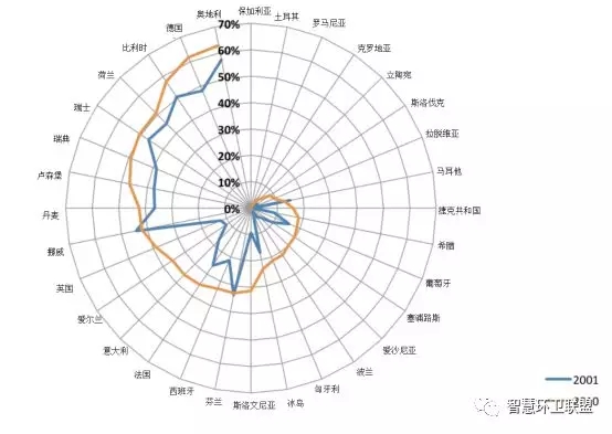 歐盟成員國會定期收集回收利用率的數(shù)據(jù),因此擁有系統(tǒng)的數(shù)據(jù)記錄,但即便如此,成員國對回收利用的定義卻也仍然存在差異——一些國家將以回收利用為目的進行收集的比例當(dāng)作回收利用率,一些國家則利用資源回收利用設(shè)施和堆肥設(shè)施的輸出作為計算的依據(jù);一些國家將焚燒發(fā)電廠最后排出的金屬和集料算入了回收利用率,另一些則將這一部分排除在外。圖9展示了歐盟各成員國在2001年和2011年時的回收利用率,可以看出,隨著回收利用率較低的成員國向著歐盟目標的不斷努力,歐盟的總體回收利用率出現(xiàn)了十分明顯的提升。
