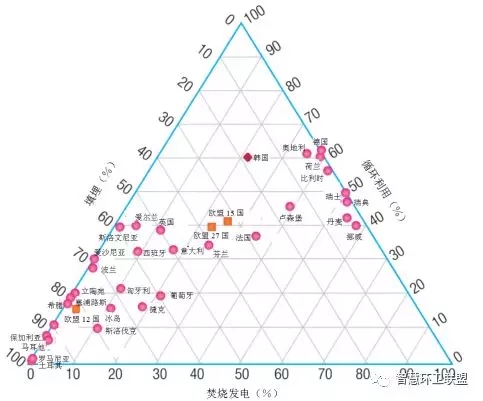 圖12展示了全球部分國家(主要為歐洲國家)通過填埋、循環(huán)利用與堆肥、焚燒發(fā)電等技術(shù)來處置廢物的比例??梢钥闯觯瑘D中的國家大體可以分為兩類,其中一類的填埋處理率為50%~100%,循環(huán)利用率則在0~40%之間,位于圖表的左下角;另一類的填埋處置率不到10%,而循環(huán)利用率和焚燒發(fā)電率則均在30%~70%之間,遠離圖表的左下角。