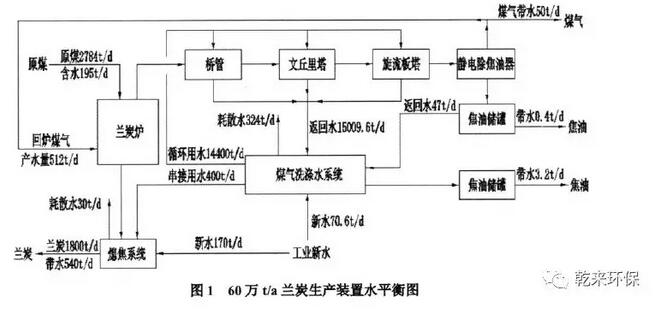 1.3蘭炭生產(chǎn)廢水:蘭炭生產(chǎn)屬于煤中溫干餾過程,干餾過程及煤氣凈化過程中形成的廢水稱為蘭炭生產(chǎn)廢水。蘭炭生產(chǎn)廢水是一種高COD、高酚類、高氨氮、難降解的有機廢水,與焦化廢水相比,蘭炭生產(chǎn)廢水COD要高10倍左右,酚類、氨氮的濃度也遠高于焦化廢水。因此,蘭炭生產(chǎn)廢水更難于處理。60萬t/a蘭炭生產(chǎn)裝置水平衡圖如圖1所示。