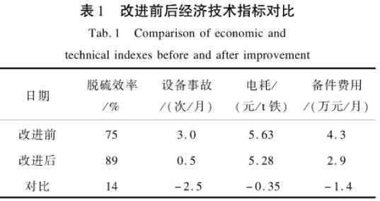 改進(jìn)前后效果對比見表1,在降低設(shè)備事故的情況下,脫硫效率由75%提高至89%。運(yùn)行成本方面,電耗降低了0.35元/t鐵,備件費(fèi)用降低1.4萬元/月,實(shí)現(xiàn)了脫硫工序的穩(wěn)定、高效、經(jīng)濟(jì)運(yùn)行。