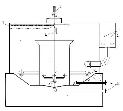 7—出水裝置;8—排渣槽;9—刮泥機(jī);10—電機(jī)及減速機(jī); 11—接觸室、分離室排污管