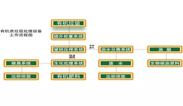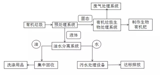 有機垃圾先進(jìn)入“預(yù)處理系統(tǒng)”,處理完成后,固體物料進(jìn)入有機垃圾生物處理系統(tǒng)”,液體進(jìn)入“油水分離系統(tǒng)”;固體最后的產(chǎn)出物為生物有機肥;經(jīng)過油水分離后的油集中回收后制作成洗滌用品,廢水經(jīng)污水處理設(shè)備處理后達(dá)標(biāo)排放。