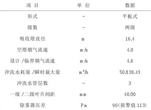 某發(fā)電公司660MW超臨界燃煤空冷機(jī)組,鍋爐型號(hào):DG2100/25.4-II2,配套建設(shè)有石灰石-石膏濕法脫硫裝置。每座吸收塔頂部安裝兩級(jí)水平布置的除霧器,參數(shù)見(jiàn)表1。