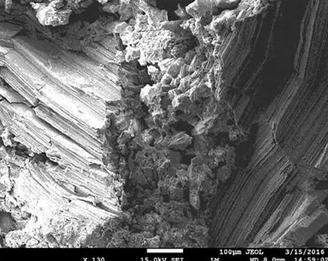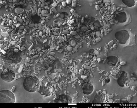 根據(jù)化學(xué)分析結(jié)果可見(jiàn),除霧器上的垢物與石膏的組成較為接近,主要成分均為CaS04˙2H20。結(jié)合除霧器的工作機(jī)理,可以認(rèn)為除霧器的垢物與石膏的來(lái)源均為脫硫漿液所攜帶的固體顆粒物。但是掃描電鏡微觀顯示其晶體形態(tài)完全不同,除霧器垢物是顆粒與片狀晶體的混合物,而脫硫石膏呈現(xiàn)出顆粒狀(或短柱狀)晶體結(jié)構(gòu)。