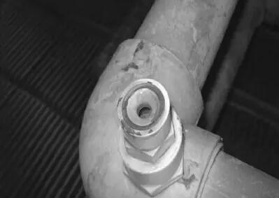 在事故發(fā)生后,檢修人員對(duì)該機(jī)組沖洗水管道和噴嘴進(jìn)行了逐個(gè)檢查,結(jié)果表明50多個(gè)噴嘴發(fā)生了堵塞或脫落。原因是噴嘴形式為軸向?qū)嵭腻F,外觀如圖3所示,兩級(jí)除霧器下表面沖洗水管上的噴嘴均為噴口向上,除霧器葉片上脫落的軟垢極易進(jìn)入噴嘴的出口,由于不是連續(xù)沖洗,噴嘴出口堆積的軟垢經(jīng)過(guò)一段時(shí)間的停留,會(huì)變得結(jié)實(shí)從而造成噴嘴堵塞。