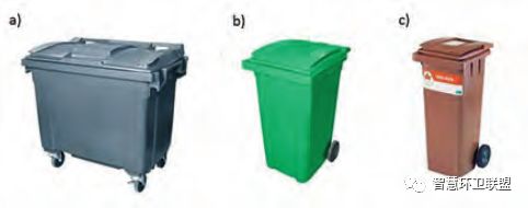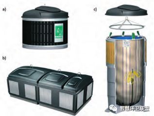 為了進行廢物的投放,產業(yè)所有者或物業(yè)管理公司應當為住宅提供生活垃圾的投放點。投放時采用的容器分為普通容器(更為常用)和埋入式容器(正在普及)兩種。常用的普通投放容器分別為140升(圖8中c)、240升(圖8中b)、600升(圖8中a)這三種。普通投放容器的缺點是,雖然容積不大,但卻會占據將對較大的空間。埋入式容器部分設置于地下,內部配備高強度織物容納袋,容納能力遠高于普通容器,能夠在節(jié)省空間的同時,起到降低收運頻次的作用。收運時,收運車輛會將織物袋從容器中取出,通過打開袋底的機關清空廢物。