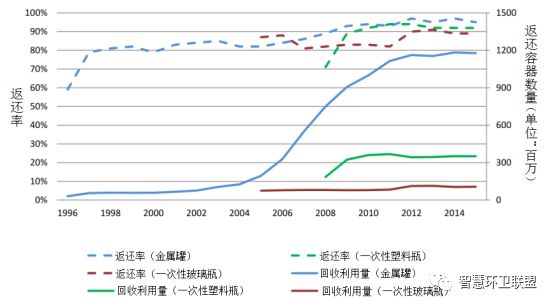 芬蘭的押金體系實現(xiàn)了極高的回收率。在PALPA體系剛剛成立的1996年,一次性金屬罐的回收率就已經達到了59%,并馬上于第二年上升到了79%。到了2009年,金屬罐的回收率已經超過90%。同樣地,PET瓶的押金體系在2008年開始實施時,返還率就已經達到了71%,之后在兩年內便上升到了90%以上。玻璃瓶在芬蘭擁有很長的押金制度實施積累,因此在PALPA在建立針對玻璃瓶的回收體系后,回收率就一直高于80%。從圖11還可以看出,一次性鐵罐的回收量自2004年起至2012年,一直都在迅速上升,并且保持穩(wěn)定的高回收率,反映出芬蘭飲料產業(yè)使用一次性金屬罐替代可重復使用玻璃瓶的趨勢??芍貜褪褂貌A康幕厥章蕜t更高,在2014年時為97%、2015年時為98%。