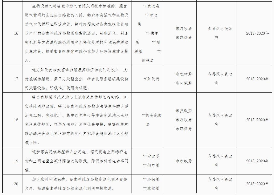 (五)推動種養(yǎng)循環(huán)發(fā)展。各縣區(qū)要盡快編制種養(yǎng)循環(huán)發(fā)展規(guī)劃,引導(dǎo)建立糧飼統(tǒng)籌、農(nóng)牧結(jié)合、養(yǎng)防并重、種養(yǎng)一體的種養(yǎng)循環(huán)綠色發(fā)展機(jī)制,促進(jìn)畜牧業(yè)持續(xù)健康發(fā)展。推動建立畜禽糞污等農(nóng)業(yè)有機(jī)廢棄物收集、轉(zhuǎn)化、利用網(wǎng)絡(luò)體系,支持采取政府和社會資本合作(PPP)模式,調(diào)動社會資本在養(yǎng)殖密集區(qū)域建立糞污集中處理中心,探索規(guī)?;?、專業(yè)化、社會化運(yùn)營機(jī)制,加快畜禽糞污處理全產(chǎn)業(yè)鏈建設(shè)。培育壯大多種類型的糞污處理社會化服務(wù)組織,實(shí)行專業(yè)化生產(chǎn)、市場化運(yùn)營。鼓勵建立受益者付費(fèi)機(jī)制,保障第三方處理企業(yè)和社會化服務(wù)組織合理收益。加強(qiáng)糞肥還田技術(shù)指導(dǎo),鼓勵沼液和經(jīng)無害化處理的畜禽養(yǎng)殖廢水作為肥料科學(xué)還田利用。優(yōu)先支持現(xiàn)代農(nóng)業(yè)示范區(qū)、農(nóng)業(yè)可持續(xù)發(fā)展試驗(yàn)示范區(qū)和現(xiàn)代農(nóng)業(yè)產(chǎn)業(yè)園在田間地頭配套建設(shè)管網(wǎng)和儲糞(液)池等方式,解決糞肥還田“最后一公里”問題。到2020年新(改擴(kuò))建大中型沼氣21處,新(改擴(kuò))建有機(jī)肥生產(chǎn)企業(yè)5家。