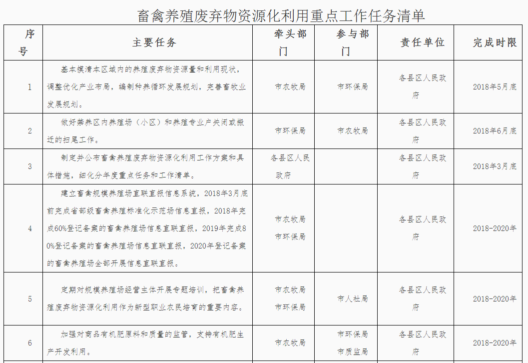 (三)落實(shí)屬地管理責(zé)任。落實(shí)“菜籃子”市長負(fù)責(zé)制,堅持保供給與保環(huán)境并重,統(tǒng)籌畜產(chǎn)品供給和畜禽糞污治理。各縣區(qū)政府對本行政區(qū)域內(nèi)的畜禽養(yǎng)殖廢棄物資源化利用工作負(fù)總責(zé),要結(jié)合本地實(shí)際,依法明確部門職責(zé),構(gòu)建責(zé)任體系,健全工作機(jī)制,加大資金投入,完善政策措施,強(qiáng)化日常監(jiān)管,確保各項任務(wù)落實(shí)到位。各縣區(qū)人民政府應(yīng)于2018年3月底前制定并公布畜禽養(yǎng)殖廢棄物資源化利用工作方案,細(xì)化分年度的重點(diǎn)任務(wù)和工作清單,并抄送市農(nóng)牧局備案。