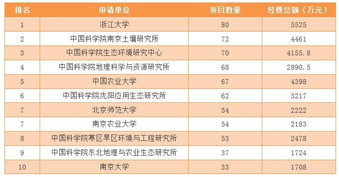 通過項(xiàng)目數(shù)據(jù)分析(見圖10),土壤污染防治領(lǐng)域在面上項(xiàng)目獲得的經(jīng)費(fèi)十年總經(jīng)費(fèi)額度排名第一,共計(jì)4.35億元,青年科學(xué)基金項(xiàng)目排名第二,約為2.13億元。排名第三位的為重點(diǎn)項(xiàng)目,共計(jì)1.02億元。面上項(xiàng)目是相對于重點(diǎn)項(xiàng)目而言,由于選題廣泛所以占比比其他類型要高。但是由于2013年起基金委出臺(tái)新政策,嚴(yán)格把控項(xiàng)目質(zhì)量。因此導(dǎo)致近幾年資助經(jīng)費(fèi)呈下降走勢。