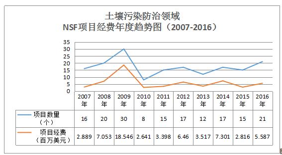 通過項(xiàng)目數(shù)據(jù)分析(見圖12),在土壤污染防治領(lǐng)域,美國國家科學(xué)基金資助經(jīng)費(fèi)在2007年至2009年呈現(xiàn)了穩(wěn)步遞增的趨勢,2009年項(xiàng)目數(shù)量達(dá)到峰值30個(gè)。2010年出現(xiàn)拐點(diǎn),項(xiàng)目數(shù)量下降為8個(gè),2011年又開始回升,之后5年一直較為平穩(wěn),2016年有所增加,達(dá)到21個(gè)。