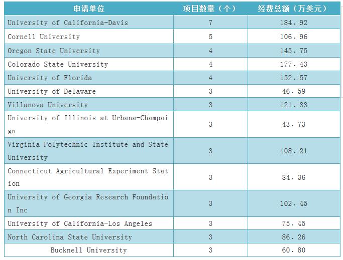 根據(jù)統(tǒng)計(jì),本領(lǐng)域申請年份在2007年至2016年間,共有135個(gè)機(jī)構(gòu)申請了美國國家科學(xué)基金。其中申請數(shù)量超過2個(gè)的機(jī)構(gòu)有14個(gè)獲得經(jīng)費(fèi)約為1496.8萬美元,如表9所示。