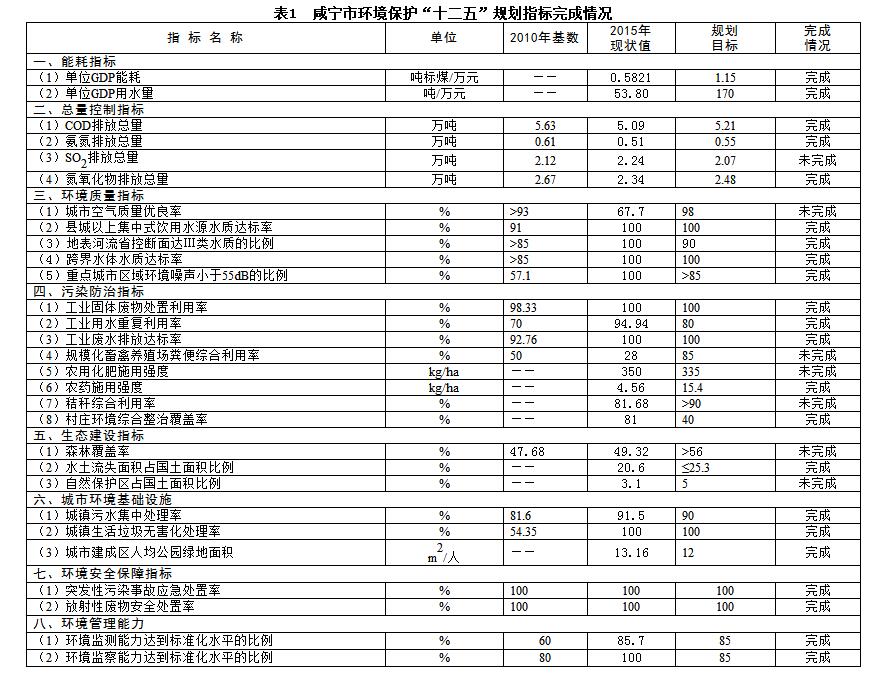 表1 咸寧市環(huán)境保護“十二五”規(guī)劃指標(biāo)完成情況
