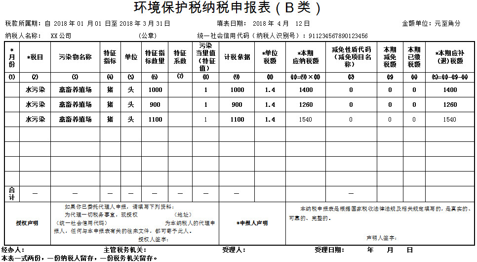 7. 環(huán)境保護(hù)稅納稅申報表(B表):適用于除A類申報之外的其他納稅人,包括按次申報納稅人、適用環(huán)境保護(hù)稅法所附《禽畜養(yǎng)殖業(yè)、小型企業(yè)和第三產(chǎn)業(yè)水污染物當(dāng)量值》表的納稅人和采用抽樣測算方法計算污染物排放量的納稅人。