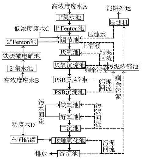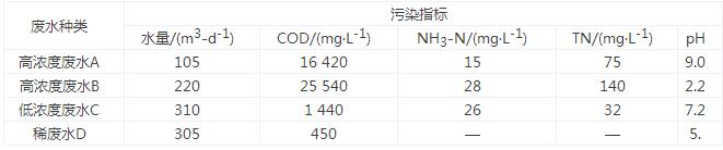 河北省某化工企業(yè)主要生產(chǎn)有機(jī)顏料,廢水來(lái)源主要是工藝廢水、廢氣吸收廢水、地面沖洗水、生活污水等。廢水按水質(zhì)可以分為4大類:第1類為高濃度廢水A(COD高、鹽分低),主要來(lái)源于精制廢水、濾洗廢水、粗品車間廢水,主要污染物為COD、苯系物等;第2類為高濃度廢水B(COD高、鹽分高),主要來(lái)源于結(jié)晶過(guò)濾廢水、濾洗廢水、精餾塔頂流出液、廢氣吸收廢水、粗品車間廢水、母液,主要污染物為COD、苯系物、二氯乙烷、二甲基甲酰胺、水合肼、鹽分等;第3類為低濃度廢水C,主要來(lái)源于消化廢水、水沖泵廢水、地面沖洗廢水、蒸餾放料槽廢水、蒸汽尾水、生活污水,主要污染物為COD、SS、氨氮、總磷、苯系物等;第4類為稀廢水D,主要來(lái)源于產(chǎn)品洗水,主要污染物為COD、SS等。根據(jù)廢水水質(zhì)不同先分質(zhì)處理,再合并處理。最終處理出水執(zhí)行《污水排入城鎮(zhèn)下水道水質(zhì)標(biāo)準(zhǔn)》(CJ343—2010)的B等級(jí)標(biāo)準(zhǔn)。各類廢水水質(zhì)水量如表1所示。