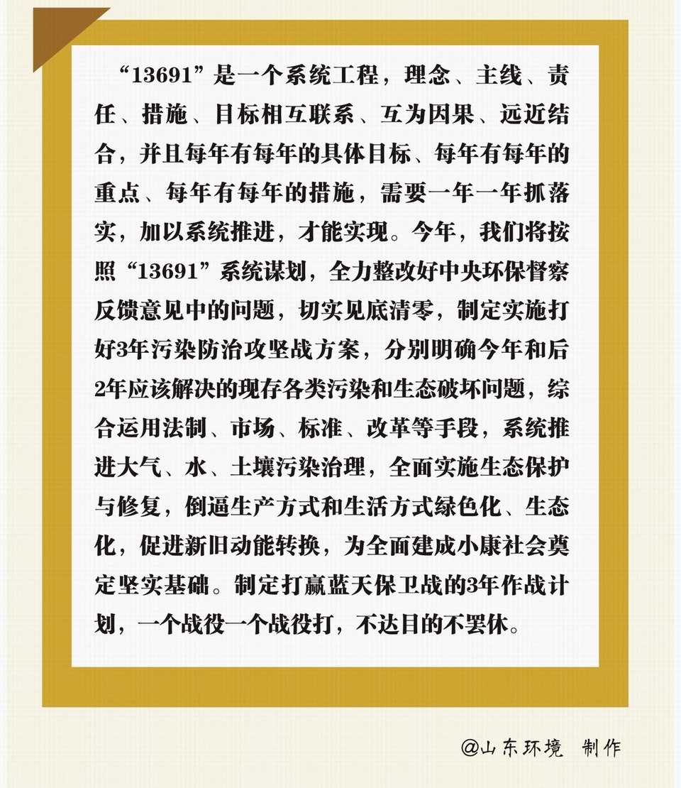 前言:2018年,山東省將按照“13691”系統(tǒng)謀劃,全力改好中央環(huán)保督察反饋意見中的問題,切實見底清零,制定實施打好3年污染防治攻堅站方案,分別明確今年和后2年應該解決的現(xiàn)存各類污染和生態(tài)破壞問題,綜合運用法治、市場、標準、改革等手段,系統(tǒng)推進大氣、水、土壤污染治理,全面實施生態(tài)保護和修復,倒逼生產(chǎn)方式和生活方式綠色化、生態(tài)化,促進新舊功能動能轉(zhuǎn)換,為全面建成小康社會奠定堅實基礎。制定打贏藍天保衛(wèi)戰(zhàn)的3年作戰(zhàn)計劃,一個戰(zhàn)役一個戰(zhàn)役打,不達目的不罷休。